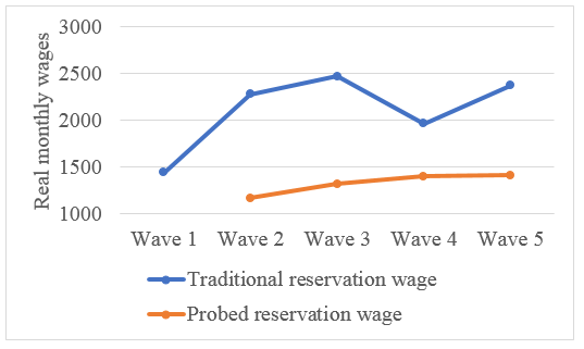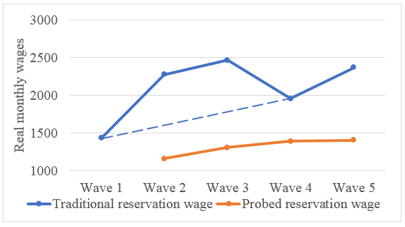 It is instructive to see whether or not the two measures produce substantively different values for reservation wages. For the whole sample, 60% of the respondents reported a ‘lowest acceptable wage’ (to the first, traditional reservation-wage question) that was subsequently contradicted in a later question by their expressed willingness to accept a lower hypothetical wage offer that was linked to a specified occupation. For the youths who had never worked before or who resided in districts with a high level of unemployment, this share is significantly higher at around 67%. Figure 1 shows a persistent gap between the ‘traditional’ measure (blue line) and the ‘probed’ measure (orange line) of reservation wages reported by the youth in the sample.