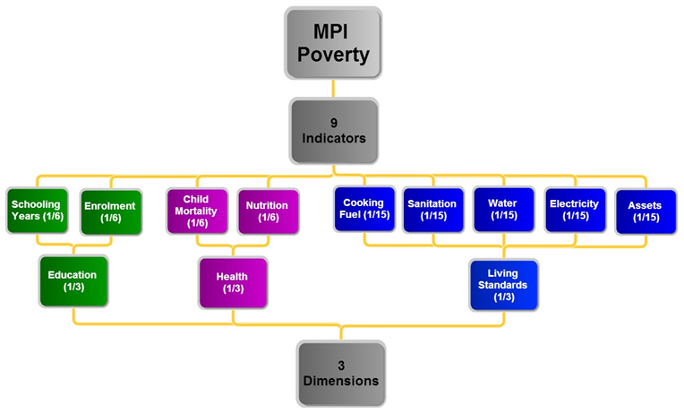 For each household, a value can be calculated for each of the nine indicators, using the relevant data from the two surveys. This value indicates the level of attainment or access in that dimension. Every individual in the household is given the same MPI score, which enables analysis at the individual level. If a person has a value below an indicator’s threshold value, it means that person is ‘deprived’ in that particular indicator (e.g. access to water).