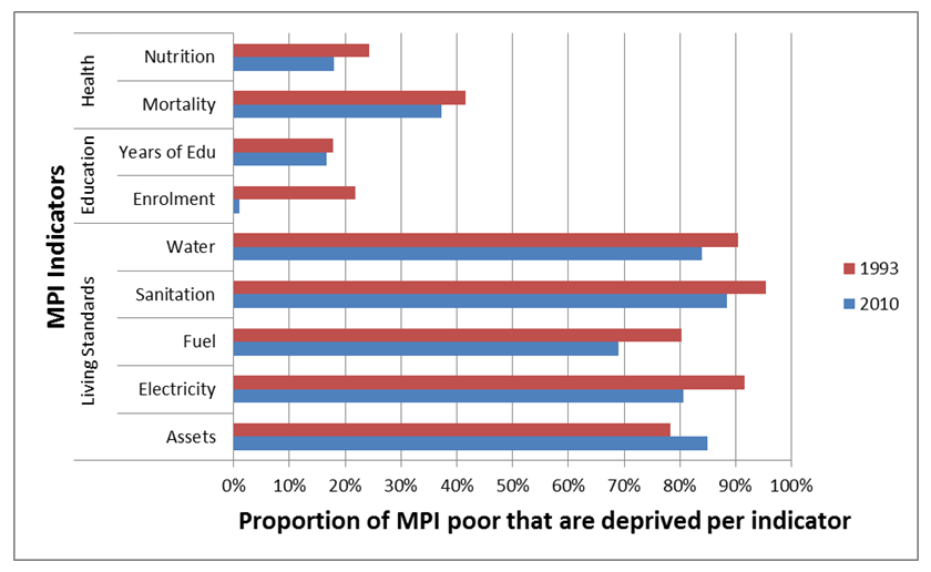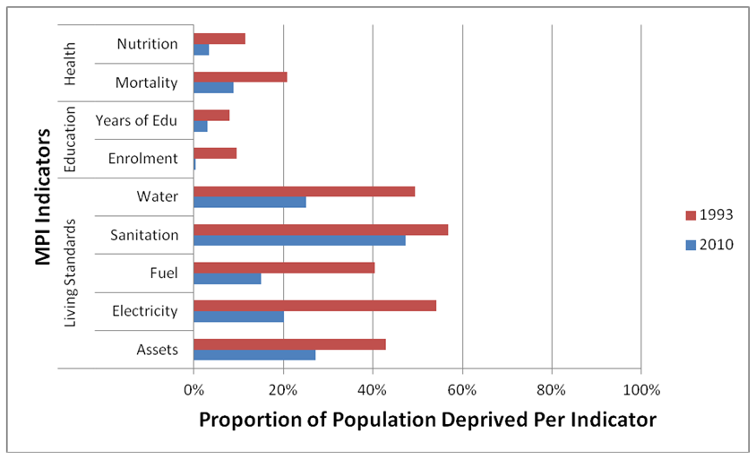 A look at the nine individual MPI indicators reveals interesting patterns. Figure 3 shows where deprivation was most concentrated among those who were multidimensionally poor (i.e. not among the population as a whole). In 1993, water, sanitation and electricity were the three indicators in which the multidimensionally poor were most deprived – more than 80% of the multidimensionally poor were deprived in these areas. In 2010 sanitation and water remained as the two areas of greatest deprivation, with asset deprivation moving into third place, now also above 80%. On the whole, the living standards dimension remains the main source of deprivation.