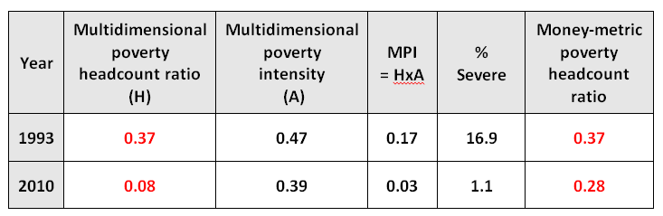 When the changes in H and A are taken together, they indicate that in 2010 there were significantly fewer multidimensionally poor people; and that those who were still poor, were somewhat less poor than in 1993.