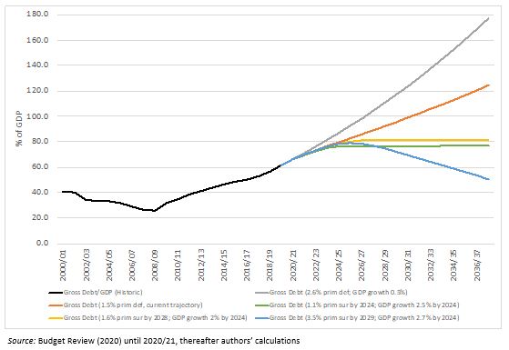 Note that both scenarios three and four stabilise the debt-to-GDP ratio at very high levels that leave little, if any, room for the government to implement counter-cyclical policy in the event of an economic downturn. A shock to GDP such as the 2008 global financial crisis (or possibly the 2020 Covid-19 crisis) could easily cause the debt-to-GDP ratio to spiral out of control and resume its upward path.