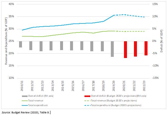 The overall budget balance is merely the difference between total government revenue and expenditure. The blue and green lines in figure 3 show the course of these two variables since FY2011. It also includes the recent budget’s projections for government expenditure and revenue for FY2021 to FY2023.