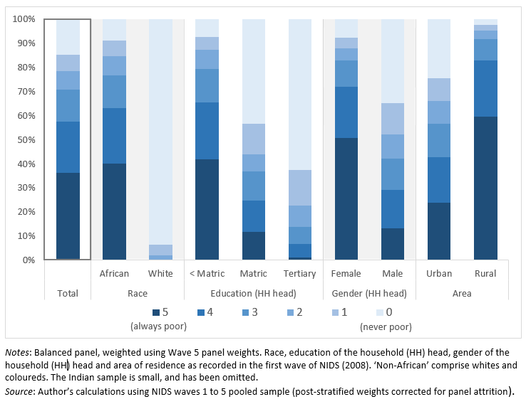 In Figure 1, we divide the balanced sample of individuals who were successfully interviewed in all five survey waves (i.e. the panel population) into six groups. This is done according to the number of times that they are observed to be poor – referred to as poverty ‘spells’.[2] We then compare these patterns of poverty across several demographic groupings (race, gender, education and location).