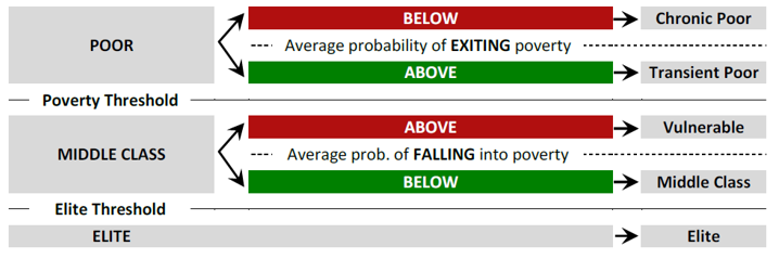 Next we add nuance to this class structure. Among the poor, we distinguish between two sub-groups: (a) those with below average chances of getting out of poverty and thus a comparatively high risk that their poverty will persist (whom we term the chronic poor) and (b) those with above average chances of making it out of poverty (the transient poor). Analogously, within the middle class we distinguish between those with an above average risk of slipping into poverty (the vulnerable) and the more economically stable and secure middle class – the ‘actual’ middle class – who have a below average risk of becoming poor.[1] Figure 3 shows the structure of these five classes in a diagram.