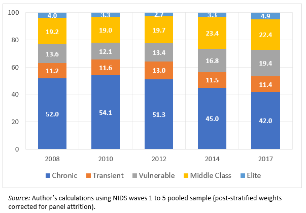 To apply this class structure to our survey data, we fit a model of poverty transitions to the panel data. The model estimates the risk to future poverty based on an individual’s current poverty status and household characteristics. In this way, for each individual we predict the probability of moving into or out of poverty.[1] Then, based on these probability scores, we sort individuals into each of the five classes. Figure 4 shows the shares of each of the five classes in the population in each of the survey years.