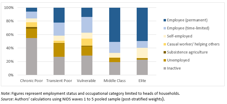 Moreover, the heads of chronically poor households are most likely to be employed in elementary occupations. Elementary occupations and service and sales occupations are also the main occupations of household heads in both transient poor and vulnerable households (and in this regard these two classes once again are very similar). As expected, white-collar occupations are most common in middle class and elite households.