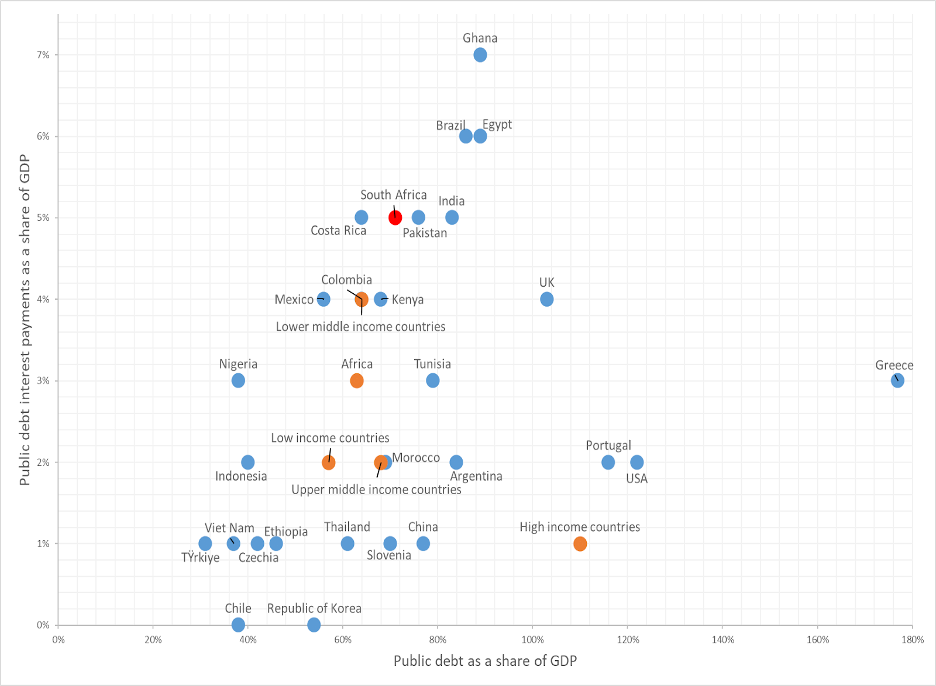 Given a lower-than-expected revenue shortfall and expenditure overrun, our budget deficit will be significantly lower than anticipated. The IEJ had estimated a main budget deficit share of GDP of 6.29%, which was slightly higher than the IMF estimate of 5.9%. Both these estimates implied that the gap between revenue and spending was at its highest since the Covid-19-riddled 2020/21. Regardless, these estimates would be in line with anticipated budget deficits from countries at a similar level of economic development, which were expected to average 5.87% in 2023/24 (see Figure 2). Instead, the National Treasury expects a budget deficit of 4.7%, which is 0.8 percentage points higher than what it anticipated in the 2023 National Budget. Moreover, this budget deficit is not significantly different from the 4.5% deficit we saw in 2022/23. This vindicates the IEJ’s assessment that the country is not facing an immediate crisis. However, as we show below, higher borrowing costs will need to be addressed to make the deficit sustainable.
