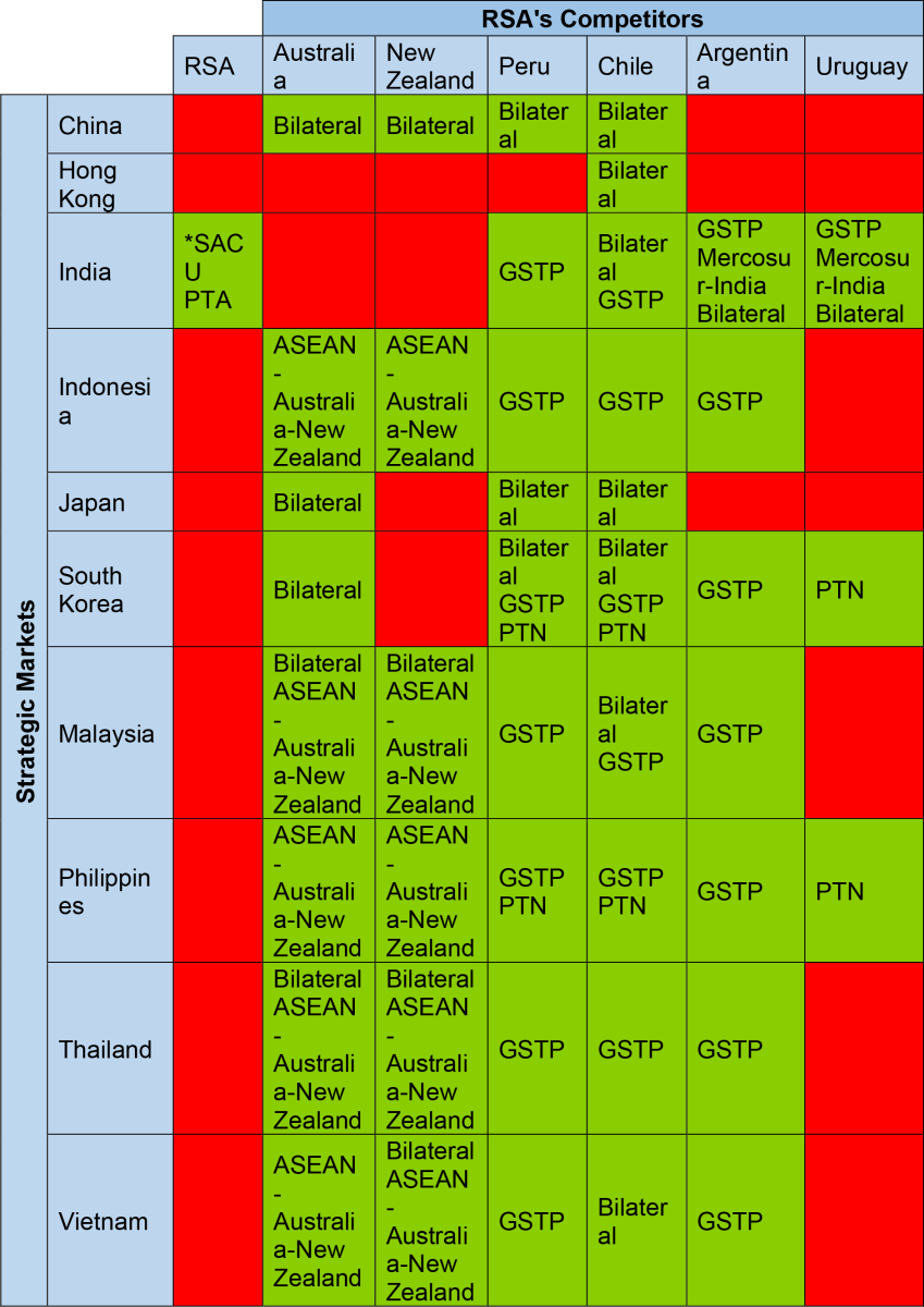 However, it is equally plausible to argue that South Africa would be best served if its market access were to be diversified beyond Africa and Europe, an argument at the core of the country's export-led strategy. The Middle East, Far East (Asia), North and South America currently account for 35% of South Africa's agricultural exports. This is perhaps where most of the attention and pursuit of FTAs would be more critical. Some of South Africa's fiercest competition is from "Global South" producers such as Chile, Peru, Australia, Argentina, New Zealand, and Uruguay. They have struck various forms of trade agreements with third markets in Asia, the Middle East ,and the Americas. Table 2 below compares South Africa and its competition in Asia – South Africa only has the SACU India preferential trade agreement (PTA), which is yet to be finalized after 15 years of negotiations.