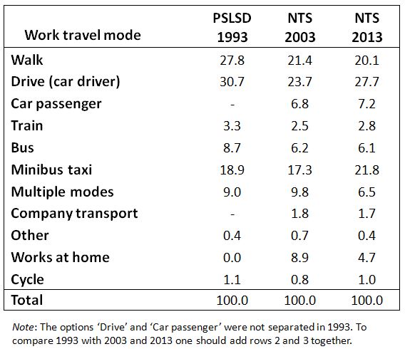 Table 1 shows that driving and using minibus taxis were the two most important forms of commuting in 2013. Together, these two forms of transport account for just less than 50% of commuting. If car passengers are included, this amounts to around 57%. Walking, whilst important, has become a less common way of getting to work – only 20% of commuters walked to work in 2013 compared to 28% in 1993.