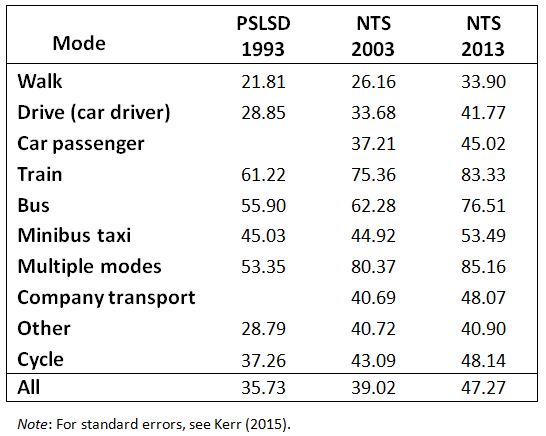 To undertake this analysis I use data from three nationally representative surveys to analyse changes in commuting patterns and commuting costs between 1993 and 2013 (see Kerr 2015 for more detail). The surveys are the 1993 PSLSD conducted by SALDRU[1] and the 2003 and 2013 National Travel Surveys (NTS) conducted by Statistics South Africa.