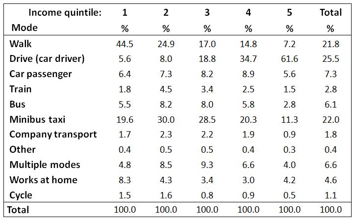Row 2 shows that driving to work is done mostly by the higher income groups, while a minibus taxi is the most common way in which those in the second and third quintiles (row 6) commute to work. From rows 1 and 10 it is clear that a majority of those in the lowest income quintile either walk to work or work at home. Only 7.3% (= 1.8 + 5.5%) of those commuters in the lowest quintile use buses or trains which are likely to be subsidised by the state. (In comparison, this value is 12.7% in quintile/column 2, 11.4% in quintile 3, 8.3% in quintile 4 and 4.3% in the top quintile.) This means that government’s transport subsidies seem to benefit those in the lower middle of the income distribution (quintiles 2 and 3) most.