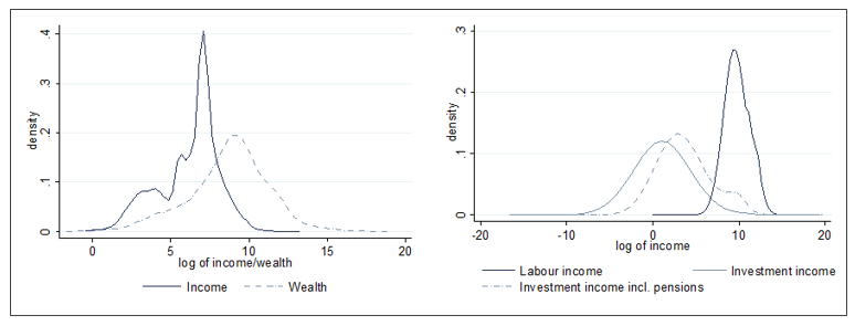 In the NIDS-based diagram on the left, the (dashed) density curve for wealth is much wider than that for labour income (solid line). This shows that wealth is much more unequally distributed than income. The right-hand diagram, using the PIT data, shows a similar result: a wider distribution for investment income than for labour income. Despite using two quite different data sets, the distributional analysis show similar tendencies.