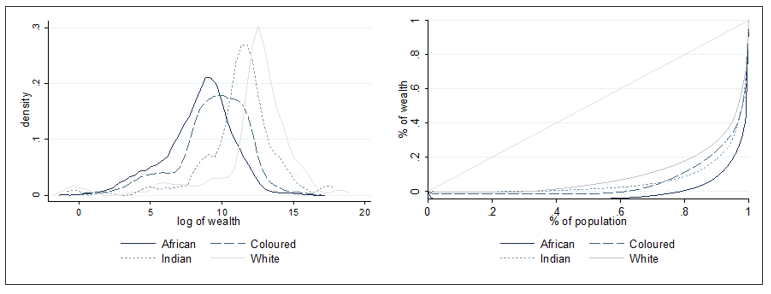 The difference in the distributions between population groups can be seen in Figure 2. The left-hand diagram shows density curves of wealth for each racial group.
