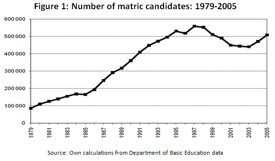 DoE administrative data show a sudden decline in total primary and high school (i.e. grades 1 to 12) enrolment from 12.08 million to 11.66 million between 1998 and 2003 (Kraak 2008:12). This implies that about 425 000 fewer learners were enrolled at school in 2003 than in 1998. Estimates based on household surveys show an even larger decline in enrolment of 515 000 learners. Matric candidates decreased by 20% between 1998 and 2003 (see figure 1). These declines reversed a previous trend of gradually growing enrolment numbers.