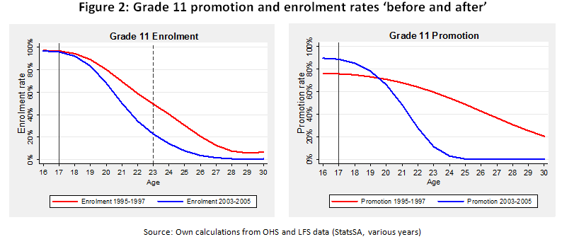 Figure 2 shows the estimated enrolment and promotion rates for grade 11 learners. These are typical of the pattern for other grades. Consider the left-hand diagram first. The red curve shows the rate of enrolment for learners of different ages prior to the implementation of the new policies. The rate of enrolment was very high for grade 11 students of 17, the correct age for their grade (indicated by the solid vertical line). For older learners, the rate gradually dropped off. After the implementation of the policies, enrolment rates (the blue line) remained very high for correct-aged learners, but dropped off much more than before for over-aged learners. For example, prior to 1997 approximately half of 23 year old learners who had completed 10 years of schooling continued at school; by 2003 that proportion dropped to less than a quarter (see the vertical dashed line). This is exactly what these policies aimed to achieve.