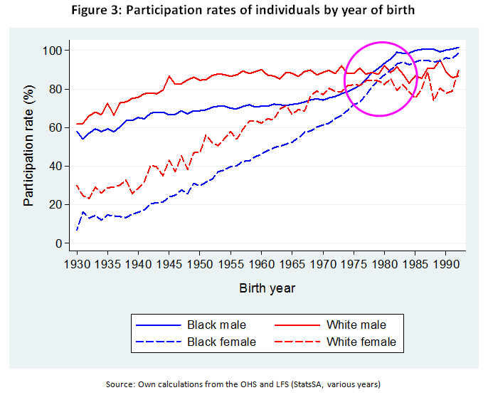 We proceed to consider the effects of these policies on people’s participation in the labour force and on unemployment. Data from household surveys can be used to track the labour force participation rates of individuals in terms of the year of their birth. We use a technique that removes business-cycle fluctuations and typical life-cycle patterns from the data. We can then compare the ‘cleaned-up’ participation rates across races and genders. In this way we obtain a clearer picture of participation behaviour.