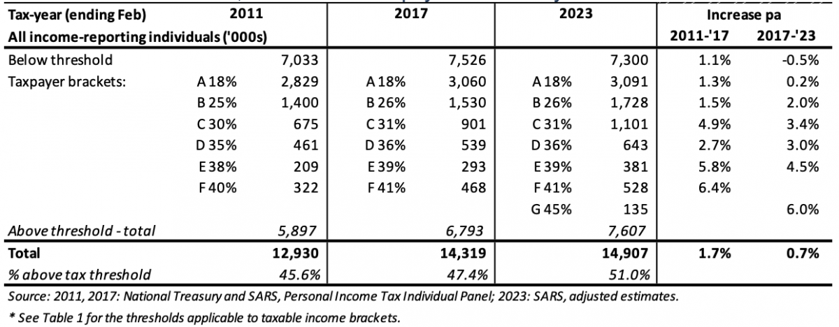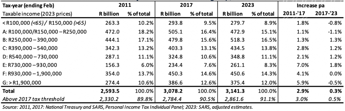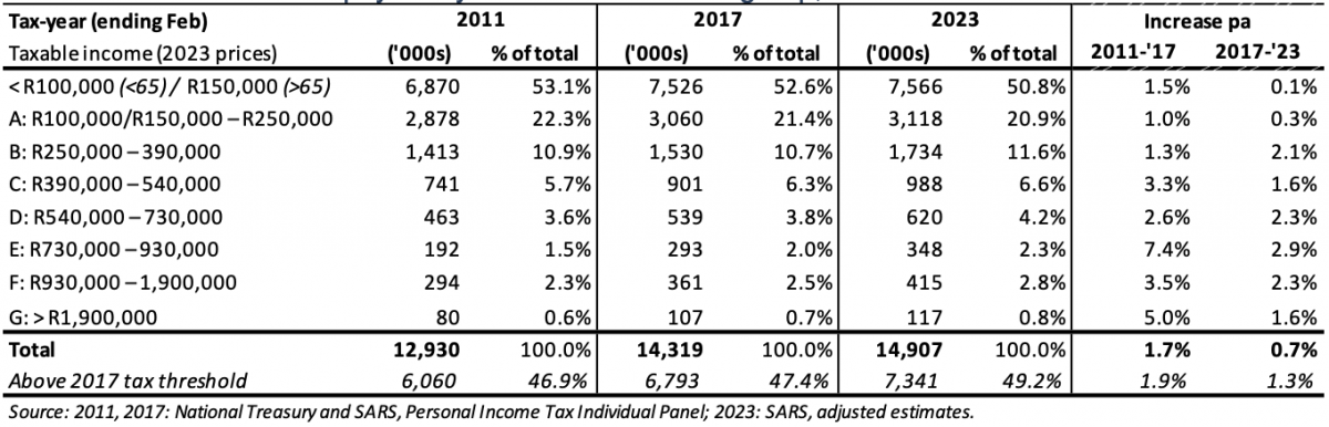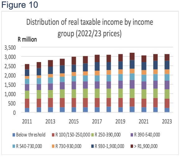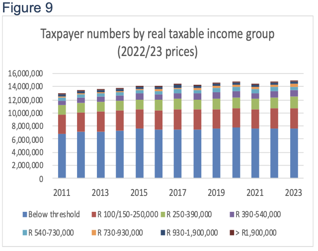 Adjusted for inflation, the fastest growth in taxpayer numbers and in taxable income has been in the R730,000-R930,000 income group (in 2023 prices).