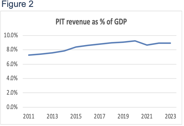 The increase in PIT revenue as a percentage of GDP is illustrated in Figure 2, against the background of slow and declining growth in GDP and the apparent decline in compensation of employees as a share of GDP illustrated in Figure 1. The severe impact of the Covid-related economic shock in 2020 is clear – not only was there a sharp decline in GDP, but PIT revenue as a percentage of GDP also fell.