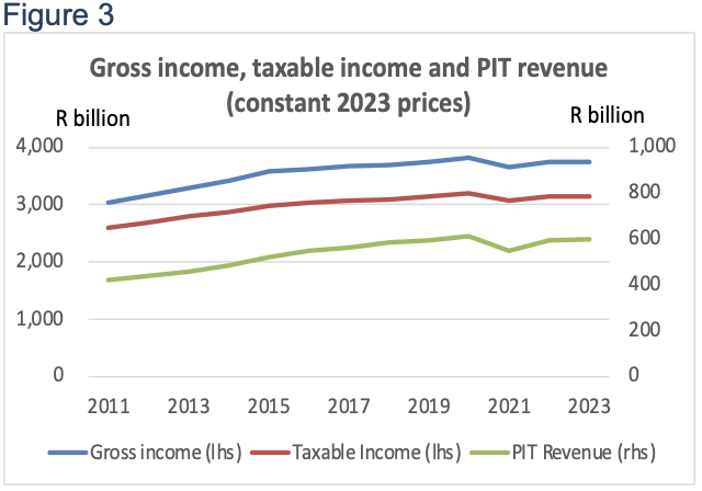 Table 2 summarises the trend in gross income, taxable income, calculated tax liability, and actual PIT revenue collected. For comparative purposes, estimates are provided of actual “ordinary” PIT revenue, comprising total PIT revenue plus ETI credits paid less the tax paid on lumpsum retirement fund payments, adjusted for refunds paid across tax-years. Calculated tax liability is, as expected, marginally higher than actual ordinary PIT revenue in the years shown.