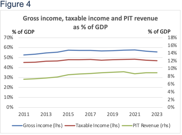 Figures 3 and 4 illustrate the gross income and taxable income series derived from this analysis, together with actual PIT revenue collected, in constant (real) prices, adjusted by CPI, and as a percentage of GDP.