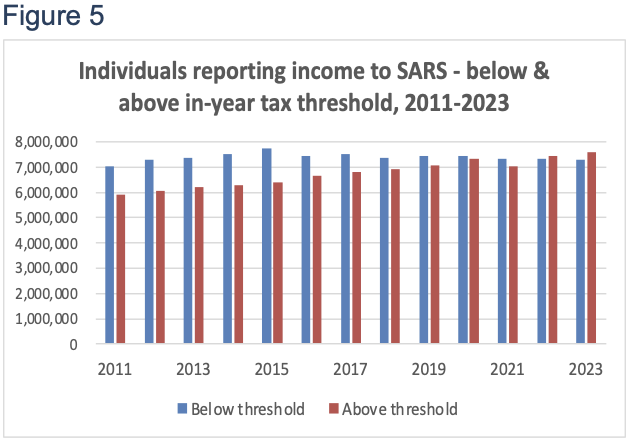The personal income tax system relies largely on statutory returns by employers, retirement funds, medical schemes, and financial institutions. Those earning more than R500,000 a year or who meet other specified criteria are required to submit individual returns for assessment; however, for most people “final” tax liability is determined by information on income and deductions provided by employers. The personal income tax register contains some 25 million individuals, but many of these are inactive. The number of unique individuals for whom income is reported to SARS is currently around 15 million, including short-term or seasonal employees, pensioners and others who receive passive income only. The total is substantially higher than formal non-agricultural employment, estimated in the most recent QLFS as 11.6 million.[4]