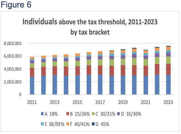 The number of taxpayers above the tax threshold increased from 5.9 million in 2011 to 6.8 million in 2017 and to 7.6 million in 2023. These increases have partly been achieved through the real decline in the tax threshold. However, the overall growth in numbers and a shift upwards in the distribution of real income account for most of this increase. Calculated by reference to the 2017 tax brackets, adjusted for inflation, the number of taxpayers above this constant-price threshold increased from 6.1 million to 7.3 million between 2011 and 2023.