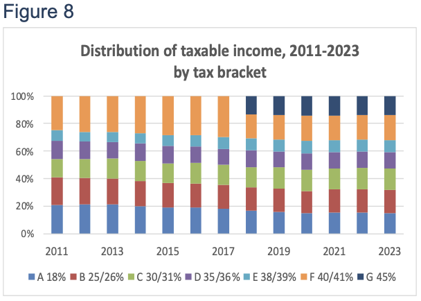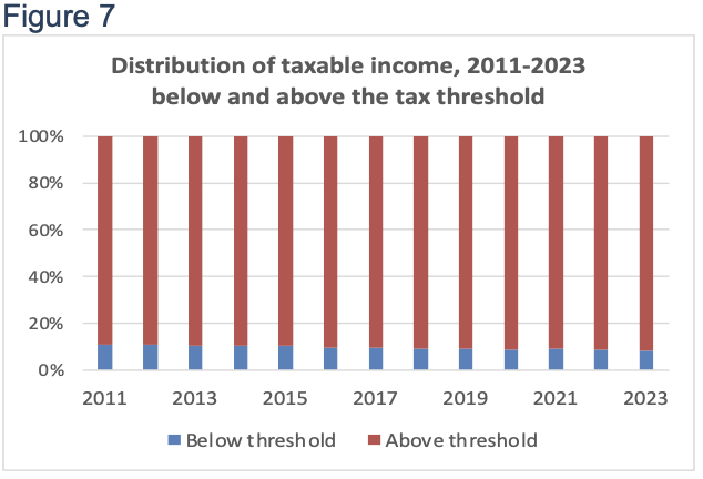 Table 4 indicates the resulting shifts in the distribution of taxable income towards higher tax brackets. In 2011, 40.7% of taxable income was earned by individuals paying marginal rates of 35% or higher; in 2023, 48.3% of taxable income was earned in these tax brackets, now 36% or higher. Income earned by taxpayers above the tax threshold has increased from 89.2% of total taxable income reported in 2011 to 91.9% in 2023, consistent with the apparent broadening of the tax base but also perhaps reflecting a widening of inequality.