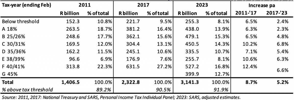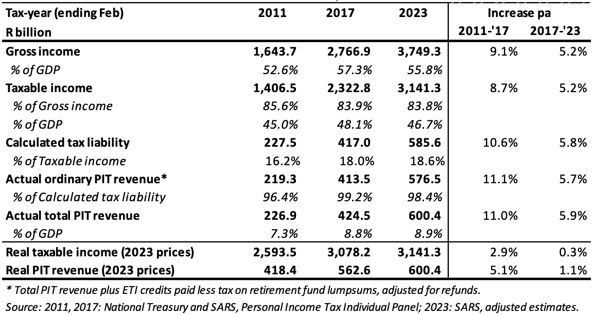 Drawing on the Individual Income Panel held in the National Treasury / SARS Tax Datalab for the 2011 – 2018 years and on a summarised tabulation of PIT tax data provided by SARS for the 2017 – 2023 years,[3] this paper provides estimates of the trend in the size and distribution of the personal income tax base over the 13 years to 2023. The analysis suggests that about a quarter of the increase in PIT revenue as a share of GDP in the period to 2020 is accounted for by the buoyancy of taxable income relative to national output. Shifts in the distribution of income together with revenue-raising policy measures account for the greater part of the rising PIT tax burden.