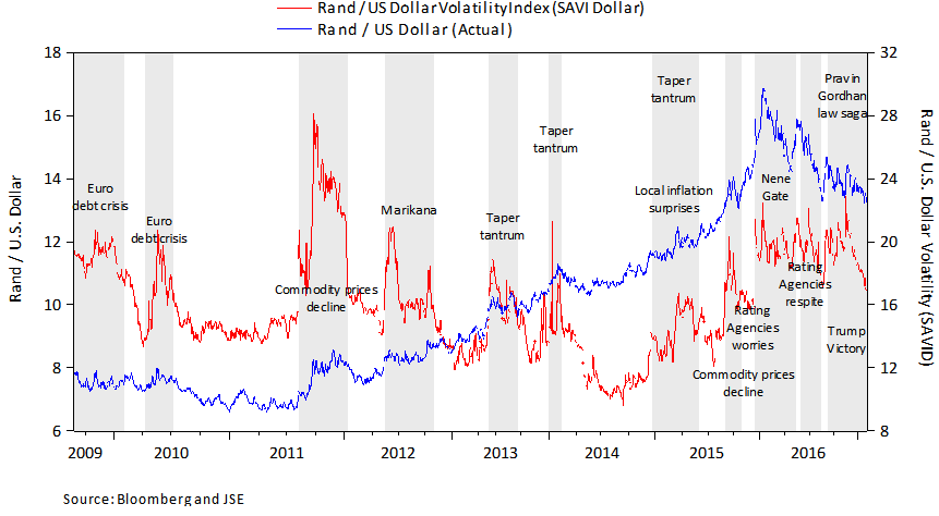 For example, in November 2016, the rand surpassed the Mexican peso as the world's most volatile currency. The three-month implied volatility for the rand versus the dollar rose to 19.3%, more than the peso’s 17.5%. What happened? Internationally, markets adjusted to Donald Trump’s unexpected victory in the US presidential elections. In South Africa the political outlook became affected by news that Finance Minister, Pravin Gordhan, was being summoned to testify to in court over his role in a former South African Revenue Service (SARS) official’s early retirement with full benefits in 2010.