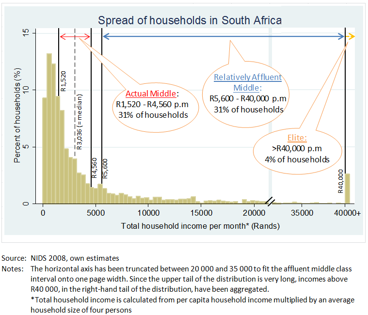 The striking South African feature is that the ‘middle class’ (as understood in everyday usage) is not in the middle of the income distribution. And those who are in the middle are not ‘middle class’ (in the sense of being above some minimum level of affluence).