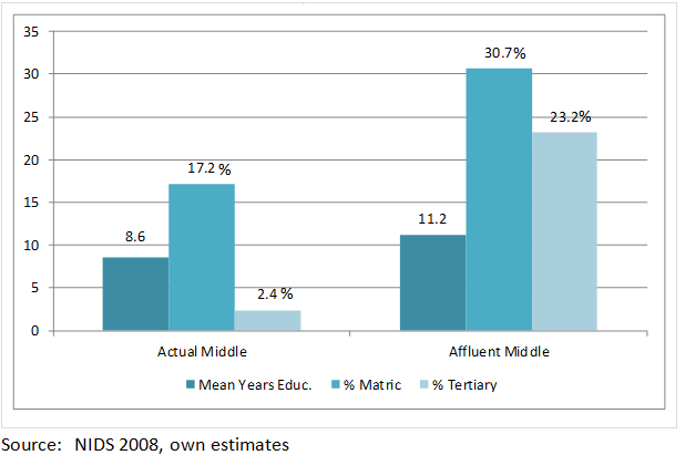 It follows that the differences between the two groups go beyond income and can be expected to reflect aspects of poverty and deprivation. Figure 2 shows that the average educational achievement of the actual middle is far below that of the affluent middle class. Whereas over half of individuals (of working age 15 – 64 years) in households in the affluent middle have attained matric or tertiary education, less than 20% of individuals in the actual middle have achieved the same.