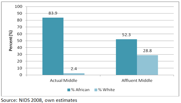 Figure 3 shows the contrast between the two definitions of the middle in terms of racial composition. People who reside in households within the actual middle of the income distribution in South Africa are overwhelmingly African, with a small minority of white households. When it comes to the affluent middle class, Africans represent just over half of all individuals.