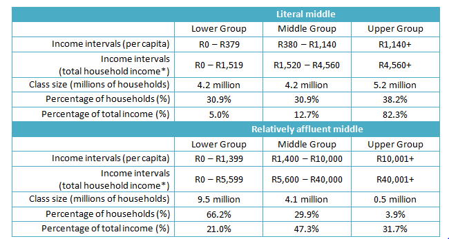 The first is a statistical approach which selects households that fall in the ‘actual middle’ of the spread of household incomes in a country. These households represent the ‘average’ household in terms of income. This approach is popular when the middle class of more advanced countries is analysed. One option is to define the middle class as households which fall within a specified income interval, defined around the middle (or median[1]) household income (see the South African example below).[2] Because of differences in the size of households and the number of mouths to feed, household income usually is divided by household size to calculate per person – or per capita – household income.