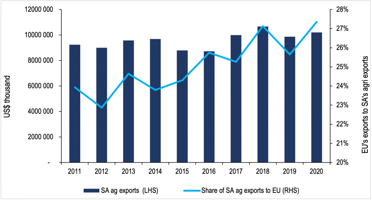 The SACU and Mozambique-EU Economic Partnership Agreement (EPA) of 2016 enhanced market access benefits for South Africa. These included fully or partially removed customs duties on 98.7% of exports, expansion of tariff rate quotas (TRQs) on key agricultural exports, and a more implementable agricultural safeguard mechanism, among others. Since the implementation of the agreement in October 2016, South Africa's exports to the EU have increased by 25%, from US$2.2 billion (in 2017) to US$2.8 billion (in 2020)[2]. The pace of South Africa's agricultural exports was declining at 2% per annum over the period 2013-2016. However, with improved market access under the SADC-EPA, the rate of agricultural exports grew by 4% per year from 2017 to 2020. But there are reasons to fear this growth will slow down as a new set of regulations, part of the EU Green Deal’s Farm to Fork Strategy, is implemented.
